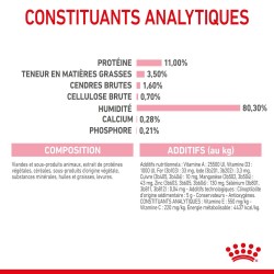 CONSTITUANTS ANALYTIQUES: Protéine: 11,0 % - Teneur en matières grasses: 3,5 % - Cendres brutes: 1,6 % - Cellulose brute: 0,7 % - Humidité: 80,3 % - Calcium: 0,28 % - Phosphore: 0,21 % - Vitamine E: 100 mg/kg - Vitamine C: 40 mg/kg