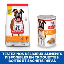 Votre chien est en surpoids ou vous souhaitez simplement le maintenir à son poids idéal ? La pâtée pour chien HILL'S SCIENCE PLAN Adult Light au poulet a été spécialement formulée pour répondre aux besoins des chiens adultes de 1 à 6 ans ayant besoin d’un faible apport calorique du fait d’une activité physique réduite. Elaboré à partir d’ingrédients de haute qualité, cet aliment humide fournit à votre chien un apport contrôlé en calories ainsi que de la L-Carnitine pour l’aider à maintenir son poids idéal. Sa teneur en fibres naturelles et en protéines de haute qualité aident votre chien à contrôler sa sensation de faim entre les repas, alors que l’apport en vitamine E et en acides gras oméga-6 favorise la bonne santé de sa peau et de son pelage. Ces boites pour chien sont le complément idéal des croquettes Hill's Science Plan Adult Light.
