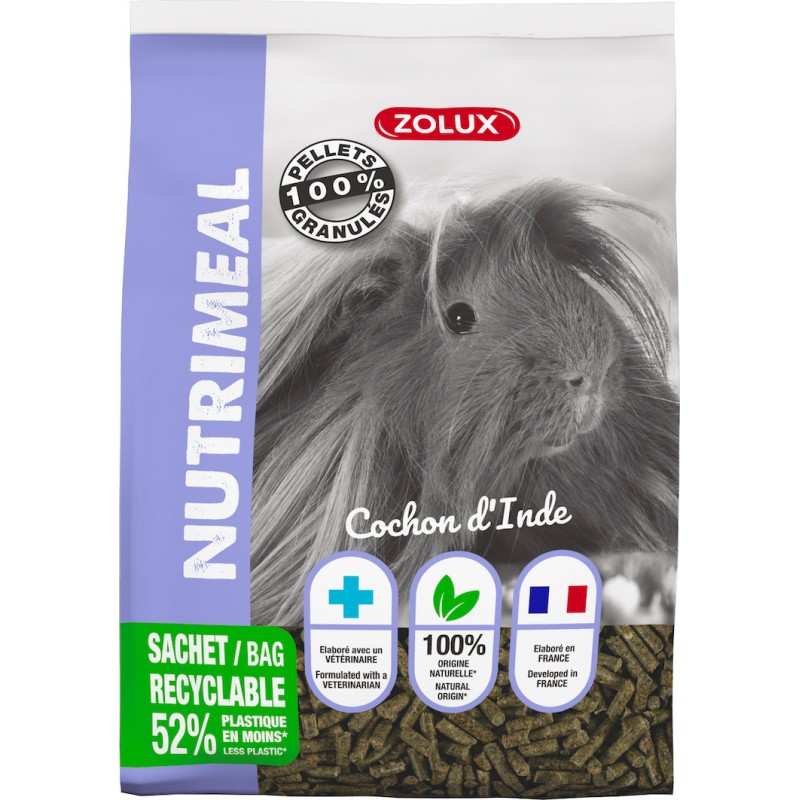 Granulés pour cochon d'inde. Elaborée en France avec un vétérinaire. Conditionnée dans notre usine de fabrication à Péronne (80, Somme).