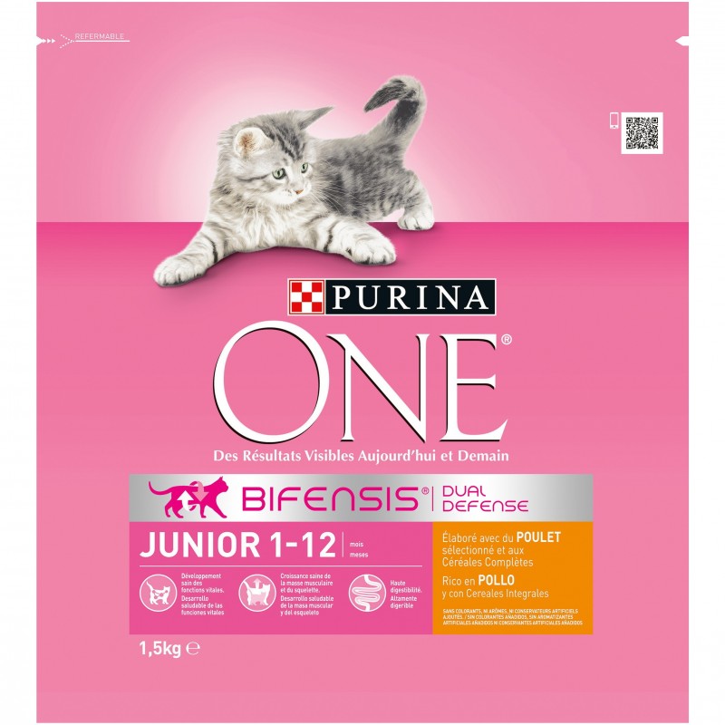 PURINA ONE Junior est spécialement formulé pour répondre aux besoins nutritionnels des chatons (du sevrage jusqu'à 12 mois) et pour les chattes en gestation ou en lactation.