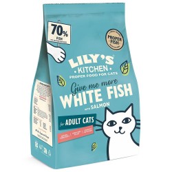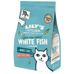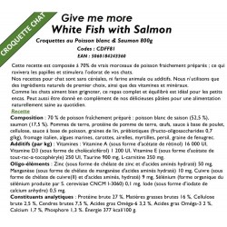 COMPOSITION: 70 % de poisson fraîchement préparé: poisson blanc de saison (52,5 %), saumon (17,5 %). Pommes de terre, protéine de pomme de terre, oeufs, sauce à base de poulet, cellulose, sauce à base de poisson, graines de lin, prébiotiques (fructo-oligosaccharides 0,7 g/kg), fromage italien, algues marines, carottes, airelles, myrtilles, persil, graine de fenugrec.