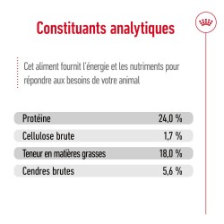 CONSTITUANTS ANALYTIQUES: Protéine: 24,0 % - Matières grasses brutes: 18,0 % - Cendres brutes: 5,6 % - Cellulose brute: 1,7 % - EPA/DHA: 0,37 %.