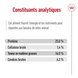 CONSTITUANTS ANALYTIQUES: Protéine: 25,0 % - Teneur en matières grasses: 14,0 % - Cendres brutes: 6,3 % - Cellulose brute: 1,4 %