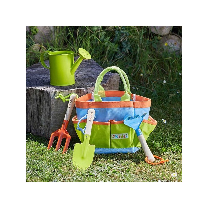 Sac à outils de jardinage contenant un arrosoir, une pelle, un râteau et une mini-fourche pour aider les grands dans le jardin. Manches d'outils en bois certifié FSC® C126085. Sac en polyester, outils et arrosoir en métal. Sac: 22 x 14 x 28 cm pelle: 21.5x6.3x2cm fourche: 20.5x7.4x2cm rateau : 15x7.5x3.8cm arrosoir: 32 x 15 x 19 cm