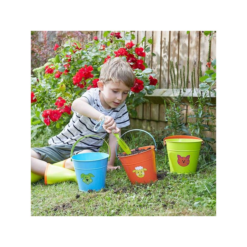 Seau pour en efant en métal. 3 coloris disponibles: bleu, orange, vert. Hanse mobile en métal. 15 x 13 x 13 cm