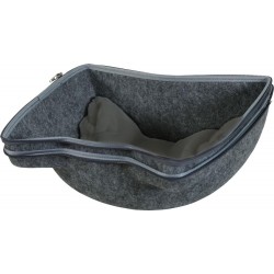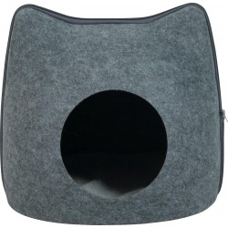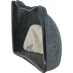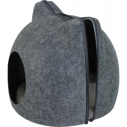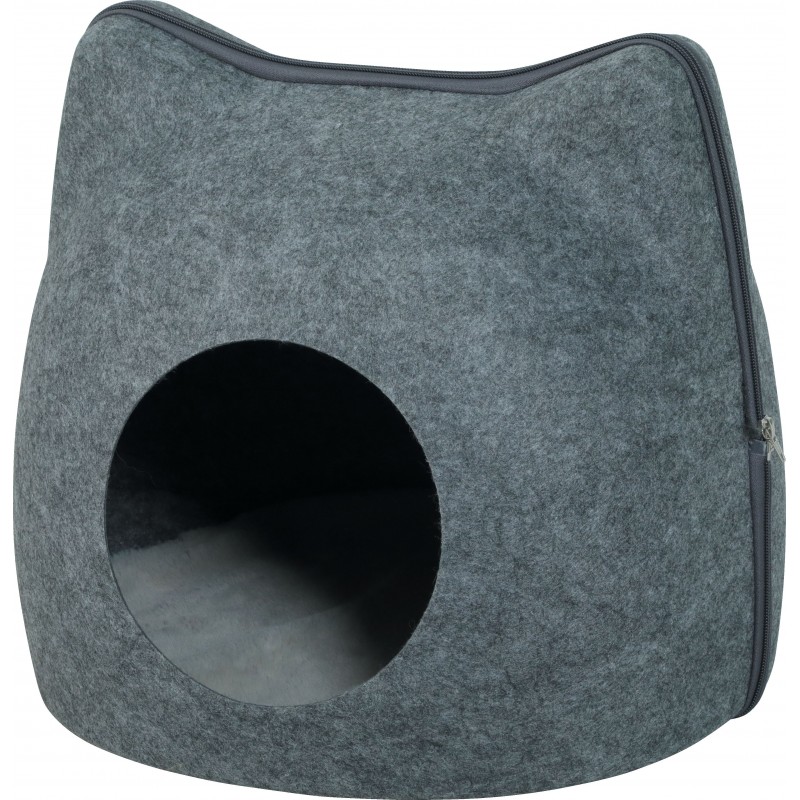 Niche pour chat en forme de tête de chat. Il dispose d’une large entrée. Coussin en fourrure ultra douce de couleur grise, amovible et lavable en machine à 30°. Pratique, il s’ouvre en deux parties grâce à une fermeture éclair avec zip. Dimensions: L41 x p38 x h36,5 cm.|