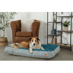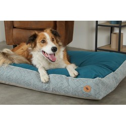 Collection de confort pour chiens KANGA, qui allie design et confort. Couchage bi-matière réalisé avec un tissu épais haut de gamme au motif graphique associé à un tissu uni en velours bleu canard. Finition passe-poils blanc. Tissu tissé polycoton 300g/m2 - Velours 100% polyester 210g/m2. Le coussin est déhoussable pour faciliter son entretien (housse lavable en machine à 30°C). Taille : 70 cm. Produit porteur du Label 1% Pour Les Animaux".