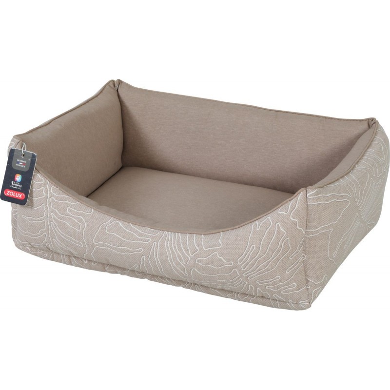 Orné d'imprimé feuillage, ce sofa gris convient aux petits chiens.