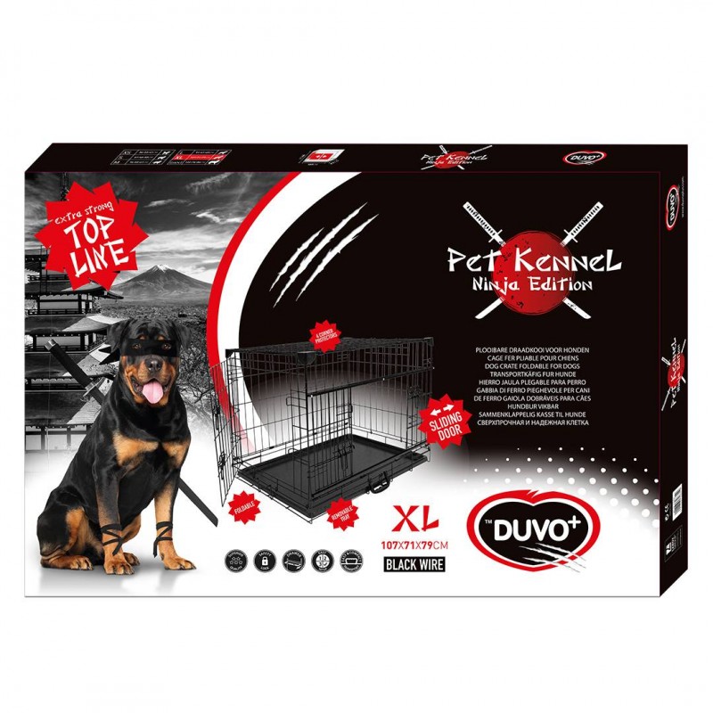 Cette cage en fer 'Limited Ninja Edition' de Duvo+ est particulièrement résistante. Les quatre protections de coin et les barreaux épais rendent cette cage extrêmement robuste et donc adaptée à toutes les races de chiens. Très facile à utiliser. En effet, la cage est munie d'une porte ordinaire sur le petit côté, mais aussi d'un système breveté de porte coulissante qui fait que la cage peut être utilisée dans des espaces réduits ou transportée en voiture. Facile à plier, avec poignée de corde et tiroir en plastique.