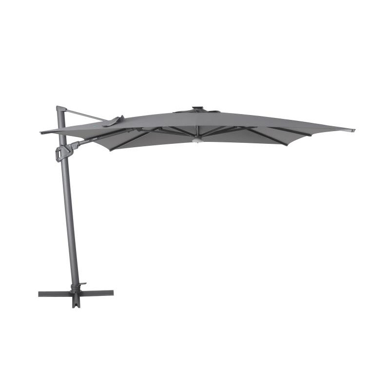 Parasol déporté orientable droite & gauche, inclinable full positions par système de crémaillère avec base rotative 360°. Eclairage LED sur les baleines et contre baleines. Structure aluminium - toile Sunbrella® 260 gr