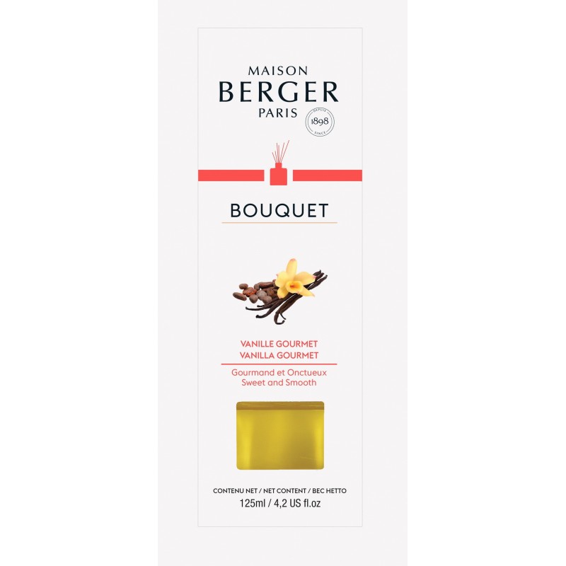 Le bouquet parfumé de Lampe Berger est un élégant diffuseur de parfum de 125 ml, en verre transparent surmonté d'une bague en métal argenté, pré-rempli du parfum 'Absolu de Vanille' développé en France par des maîtres parfumeurs.
