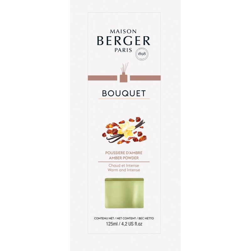 Le bouquet parfumé de Lampe Berger est un élégant diffuseur de parfum de 125 ml, en verre transparent surmonté d'une bague en métal argenté, pré-rempli du parfum 'Poussière d'Ambre' développé en France par des maîtres parfumeurs.