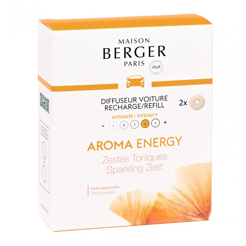 Les Recharges diffuseur voiture Aroma Energy sont idéales pour parfumer votre véhicule. Le parfum Zestes Toniques. est une ode à la fraîcheur retrouvée : l’énergie de ses notes hespéridées se drape de sensualité avec les senteurs épicées du musc.|
