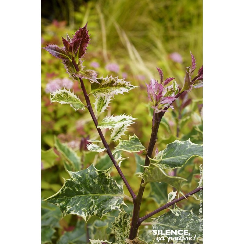 Arbuste persistant à feuillage persistant panaché de crème et pousses pourpres.
