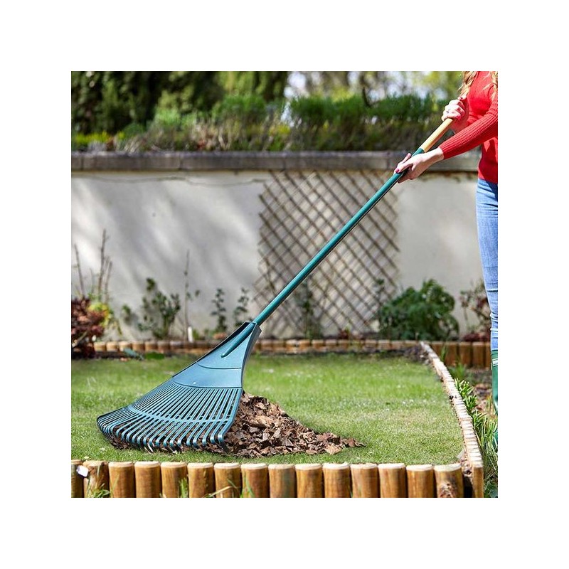 Râteau Á Feuille Pro Idéal pour ratisser les feuilles, l'herbe et autres débris de jardin des pelouses Tête extra large pour une plus grande efficacité 24 dents solides mais flexibles pour un travail plus régulier Le long manche de 165 cm réduit les flexions inutiles
