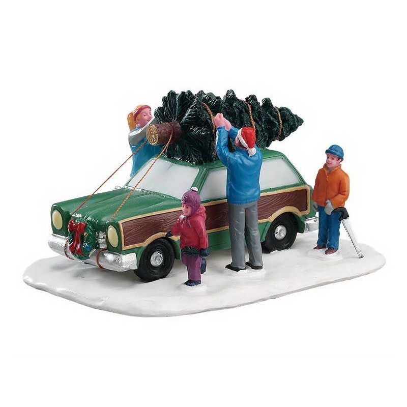 Pièce de la collection Santas Wonderland de LEMAX, représentant une famille prête à rentrer chez elle avec son arbre de Noël sur le toit de son break.