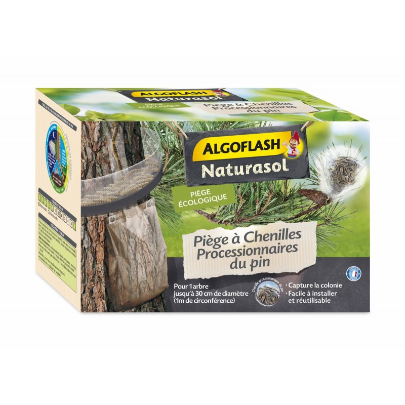 Piège à chenilles processionnaires du pin. Placer le piège autour du tronc des pins pour capturer les chenilles processionnaires du pin lorsqu'elles descendent de leurs nids pour aller s'enterrer. Une solution alternative aux produits chimiques, basé sur le mode de vie des chenilles. Facile et rapide à poser. Efficace et discret avec son sac de récupération imprimé écorce de pin.