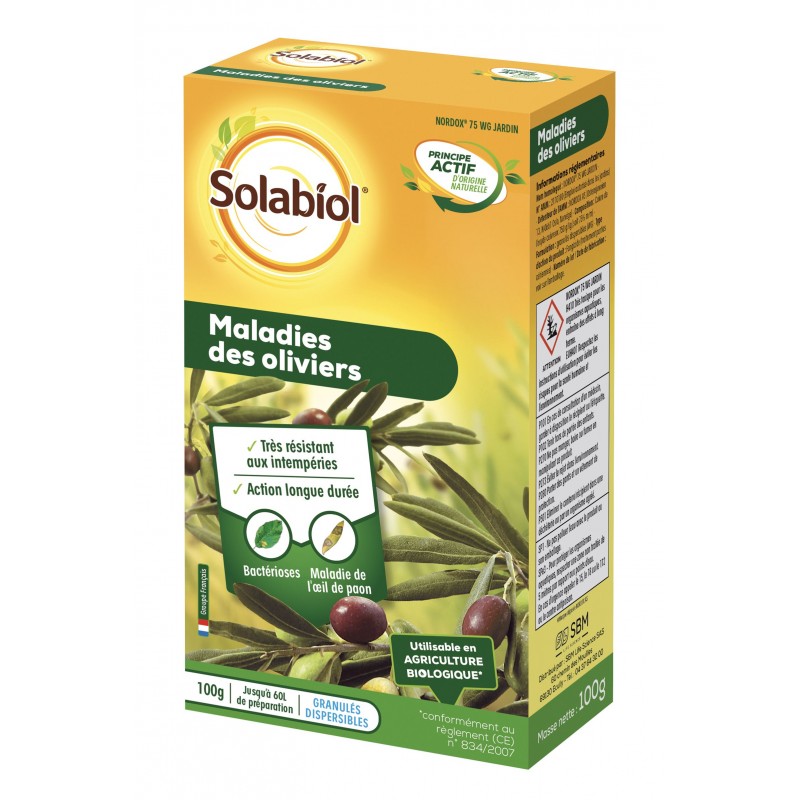 Le produit Maladies des oliviers Solabiol est directement actif sur le végétal pour lutter contre les principales maladies du potager (mildiou, bactérioses, graisses...). L'excellente micronisation du produit lui confère une très bonne mouillabilité, une forte résistance aux pluies et une persistance d'action durant le cycle végétatif de la plante par relargage progressif.