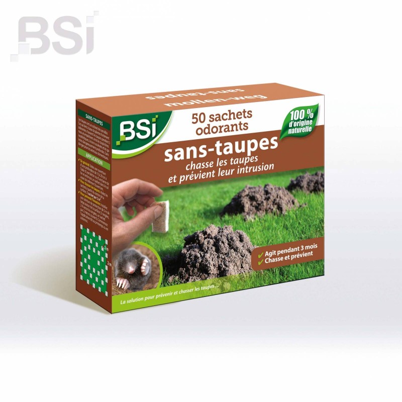 SANS-TAUPES 50 sachets odorants. Chasse et prévient les taupes dans le jardin pendant des mois. Sans danger pour les animaux domestiques et le gibier. Une boîte contient 50 sachets odorants = 100 m 2