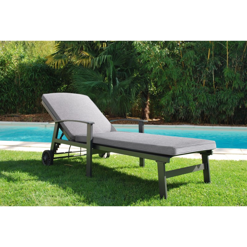 Bain de soleil avec roues structure aluminium -Toile polyester enduite de PVC. Coussin polyester teint masse 170 gr, 100% recyclé