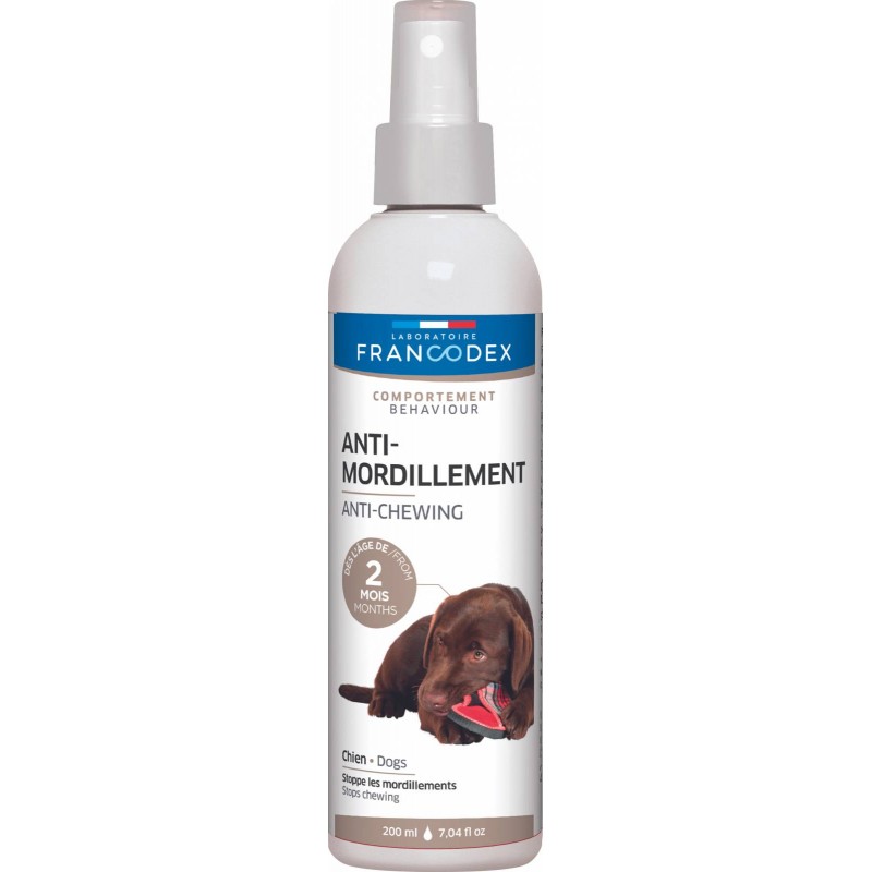 Formulé avec de l'huile essentielle d'eucalyptus, le SPRAY ANTI-MORDILLEMENT FRANCODEX permet d'éviter que votre chien abîme vos chaussures, vêtements ou meubles en les mordillant.