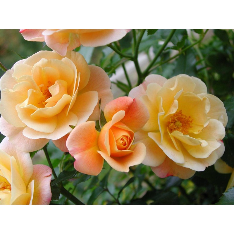 Un feuillage brillant persistant en hiver doux. Une facilité d'entretien. Un décor permanent pendant de nombreuses années. Idéal en massifs, bordures. Cet excellent rosier arbustif à port recouvrant vous offrira tout l'été des fleurs semi-doubles orange clair évoluant en jaune crème en fin de floraison. Densité de plantation: 3 rosiers au m2.