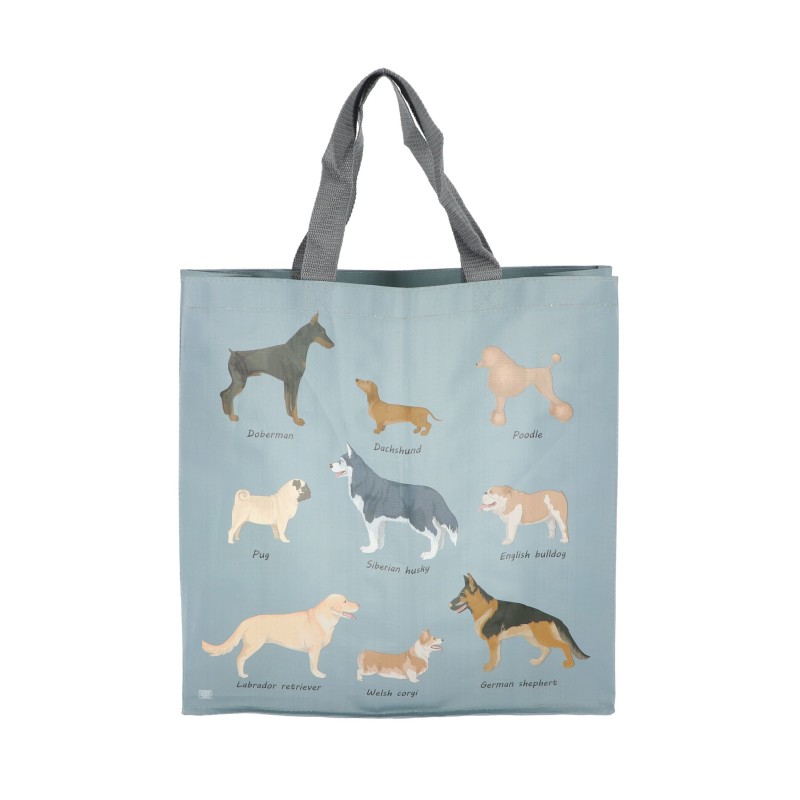 Ce sac de courses a un imprimé avec différentes races de chiens.