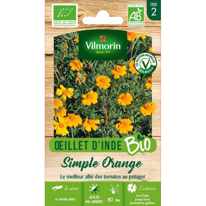Très belle variété offrant une plante haute et de nombreuses fleurs simples aux tons orange et doré, intenses et chauds. Son odeur forte et la substance sécrétée par ses racines sont toutes deux réputées éloigner certains insectes ennemis des légumes du potager (aleurodes, pucerons, nématodes).|