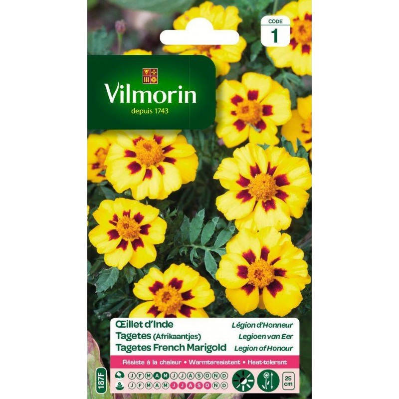 Cette variété de plante est très florifère et facile à cultiver. Elle donne de nombreuses petites fleurs simples de couleur jaune d'or et pourpre.Réputé pour éloigner les insectes, l''illet d'Inde Légion d'honneur est idéal pour embellir vos massifs bas et bordures.|