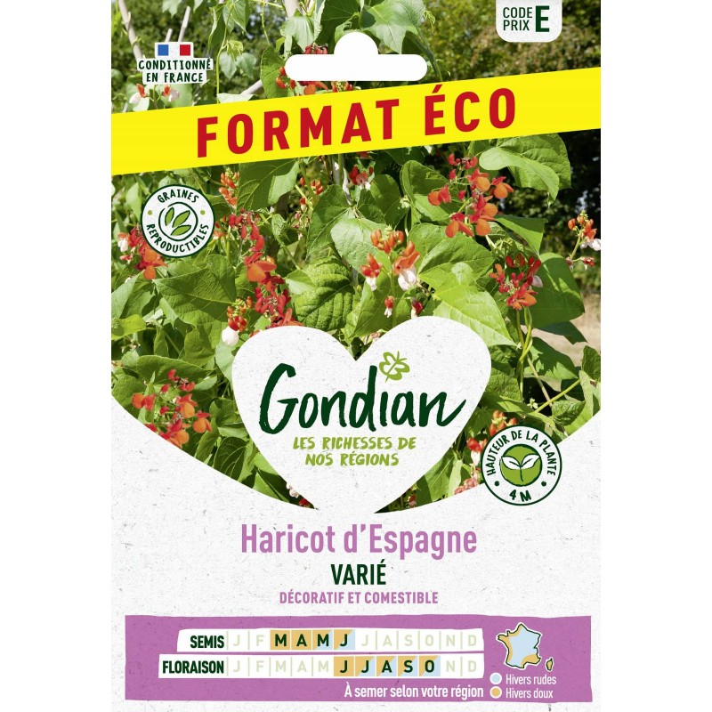 Le haricot d'Espagne est une plante à végétation vigoureuse. dont les tiges peuvent atteindre 4 à 5 m de long. Son feuillage abondant vert brillant contraste. en été. avec une profusion de fleurs aux coloris lumineux et variés : rouge. orange. blanc. bicolore. Également comestible !|