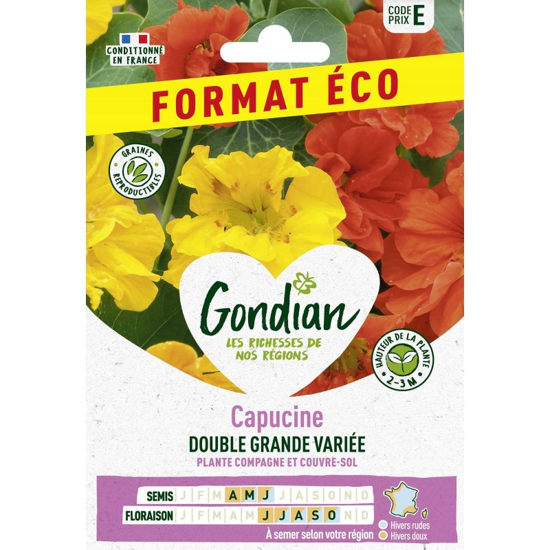 Cette capucine grimpante. aux longues tiges charnues. offre des feuilles rondes d'un beau vert et de nombreuses fleurs solitaires aux coloris étincelants et variés. allant du rouge au jaune foncé. Elle peut décorer treilles et pergolas. mais aussi servir de couvre-sol.|