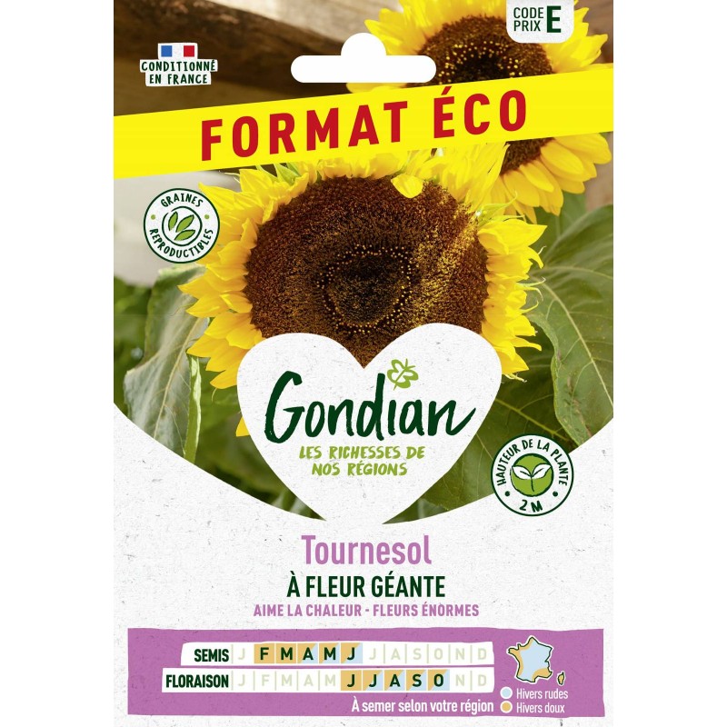 Le tournesol ornemental par excellence ! Cette variété offre d'énormes fleurs (jusqu'à 30 cm de diamètre) aux pétales jaune d'or et au cœur marron. à larges feuilles vert foncé et à hautes tiges rigides. Parfait pour constituer de somptueux bouquets.|