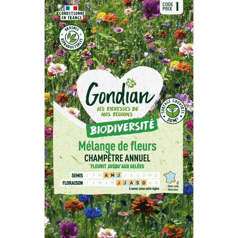 Ce mélange décoratif est composé d'une dizaine de plantes fleuries annuelles. faciles à cultiver et adaptées à toutes situations. Les cosses de sarrasin présentes dans le mélange. en plus de faciliter et homogénéiser le semis. amendent aussi naturellement le sol lorsqu'elles se transforment en humus.|