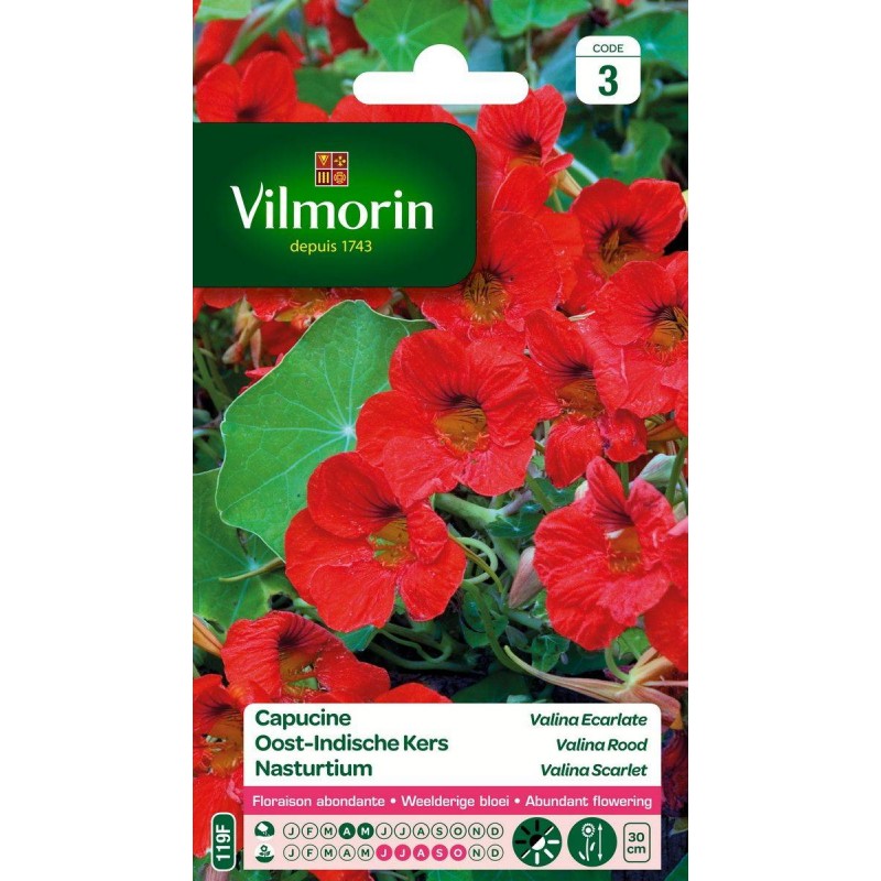 Très facile à réussir, la capucine est idéale pour fleurir vos massifs bas, bordures et jardinières. Cette variété naine, à la floraison exceptionnelle, embellira votre jardin grâce à ses magnifiques fleurs rouge-orangé sur un feuillage vert clair très décoratif. Cette variété fleurit mieux dans un sol pauvre. Elle tolère les climats maritimes.