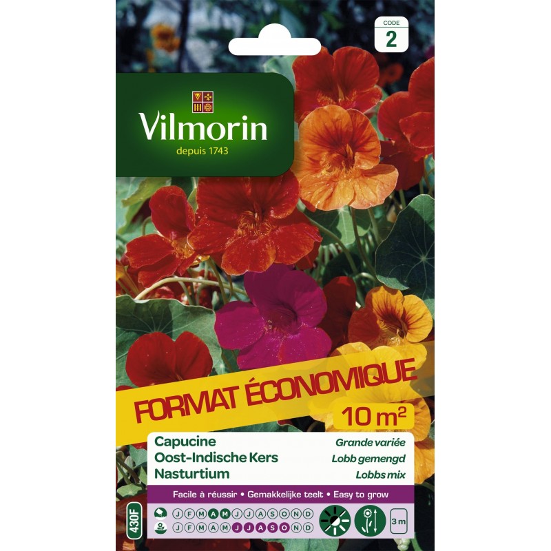 Variété grimpante aux nombreuses fleurs aux couleurs vives variant du jaune au rouge. Son feuillage limite l'apparition des mauvaises herbes.