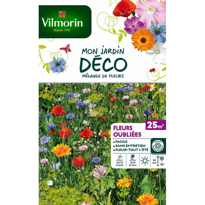Très beau mélange de fleurs authentiques introduites en France au Moyen Âge.Ce mélange est composé de Coquelourde, Saponaire, Nigelle de Damas, Aneth, Coquelicot, Chrysanthème, Clarkia, Godétia, Gypsophile, Lavatère, Lin et Souci.|