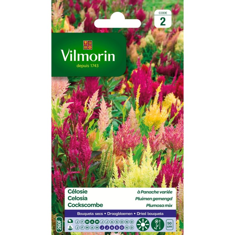 Plante compacte, aux fleurs très originales par leur forme de plumets et par leurs couleurs vives, brillantes, allant du jaune d'or au pourpre.