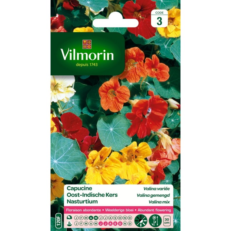 Très facile à réussir, la capucine est idéale pour fleurir vos massifs bas, bordures et jardinières. Cette variété naine à la floraison exceptionnelle embellira votre jardin grâce à ces magnifiques fleurs aux coloris très variés, vifs et lumineux. Cette variété fleurit mieux dans un sol pauvre. Elle tolère les climats maritimes.