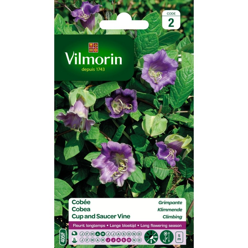 Plante grimpante à la croissance rapide, produisant de belles fleurs bleu violet en forme de clochette sur un feuillage vert franc.