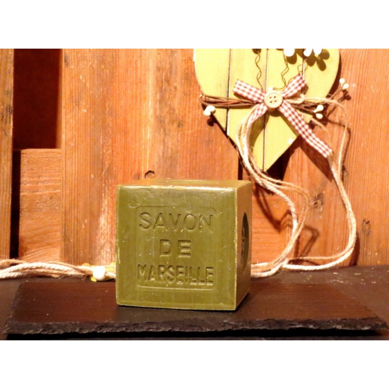 Authentique savon de Marseille, 100% naturel, fabriqué exclusivement à partir d'huiles végétales d'olive, sans aucun colorant ni adjuvant de synthèse.|