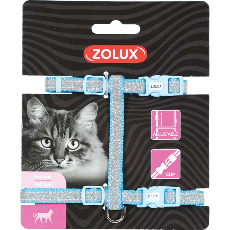 Harnais pailleté réglable en nylon équipé de boucles clips en plastique : mise en place facile et maintien optimal. « Dé » d?attache en métal pour plus de sécurité. Tour de cou de 20 à 32 cm, tour de poitrail de 25 à 45 cm. Coloris : bleu.