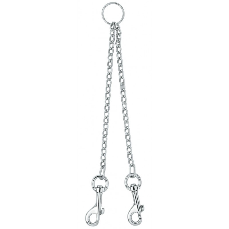 Pratique et chic, l'accouple est l'accessoire qui vous permettra de promener vos deux chiens en même temps au bout de la même laisse. L'accouple en métal est constitué d'un anneau relié à votre laisse et de 2 mousquetons pour attacher les colliers des chiens.