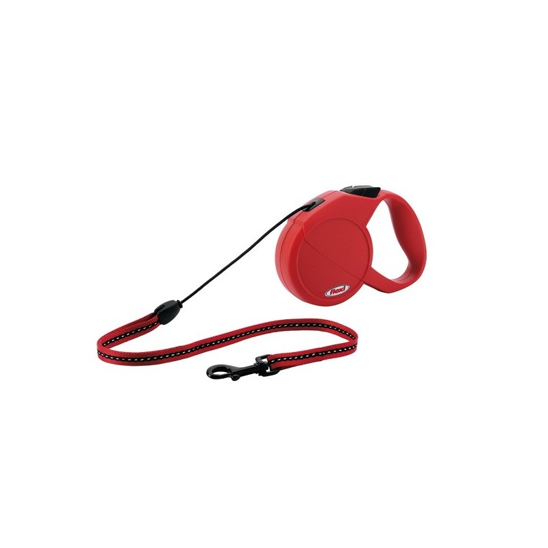 Laisse à enrouleur Flexi avec nouveau système de freinage et nouvelle forme ergonomique. Existe en rouge. en noir et en bleu. Pour chiens jusqu'à 20 Kg. laisse corde a enrouleur avec systeme court de freinage bande reflechissante sur la sangle adaptee aux accessoires flexi Multi Box et LED Lighting System|
