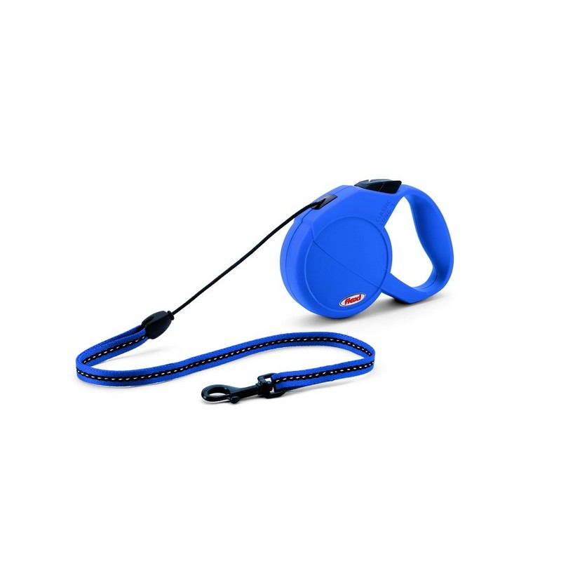 Laisse à enrouleur Flexi avec nouveau système de freinage et nouvelle forme ergonomique. Existe en rouge. en noir et en bleu. Pour chiens jusqu'à 20 Kg. laisse corde a enrouleur avec systeme court de freinage bande reflechissante sur la sangle adaptee aux accessoires flexi Multi Box et LED Lighting System|