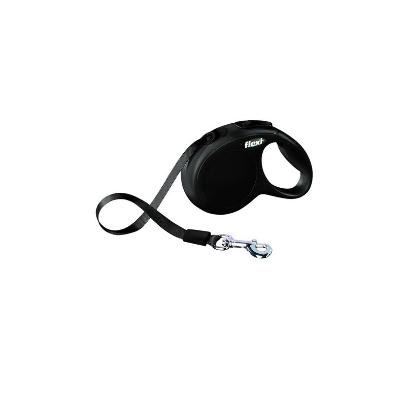 Laisse à enrouleur Flexi avec nouveau système de freinage et nouvelle forme ergonomique. Existe en rouge. en noir et en bleu. Equipée d'une sangle robuste. Pour chiens jusqu'à 12 Kg.|