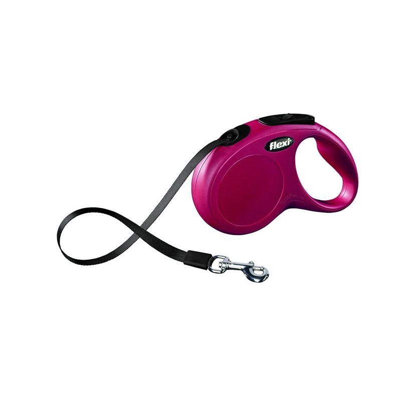 Laisse à enrouleur Flexi avec nouveau système de freinage et nouvelle forme ergonomique. Existe en rouge. en noir et en bleu. Equipée d'une sangle robuste. Pour chiens jusqu'à 15 Kg.|