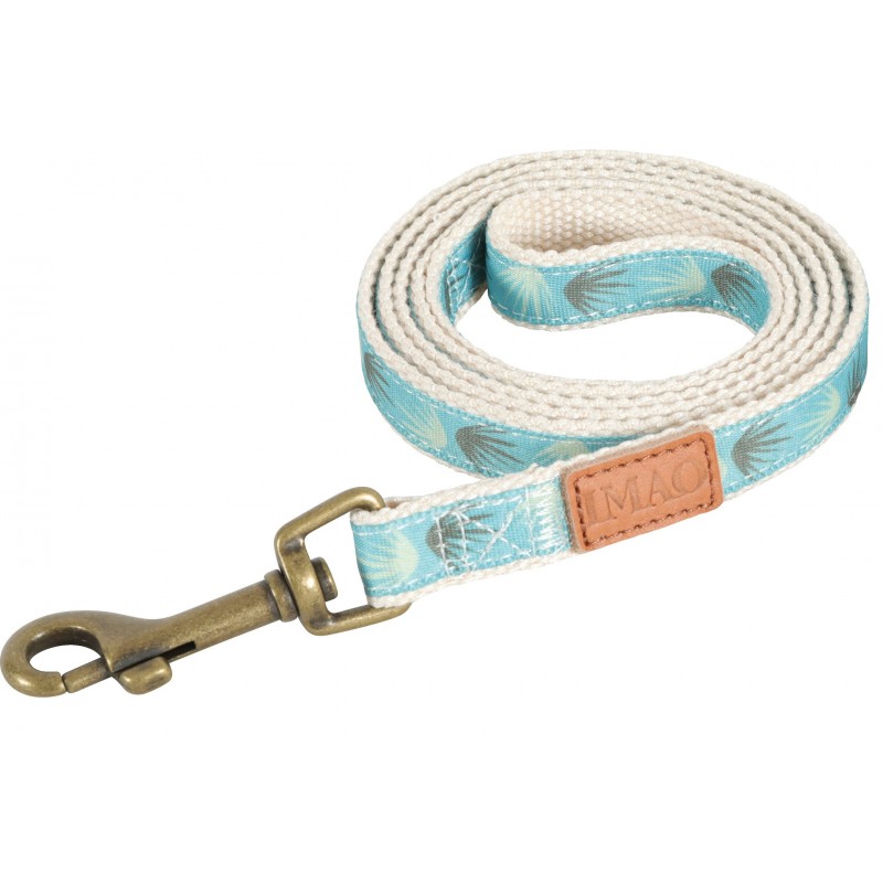 Laisse Imao Taiga d'une longueur de 1,20m, largeur de la sangle 25mm. Matières: Polyester et coton.. Dé en métal aspect cuivré. Empiecement en cuir avec inscription 'Imao'. Coloris: bleu.|