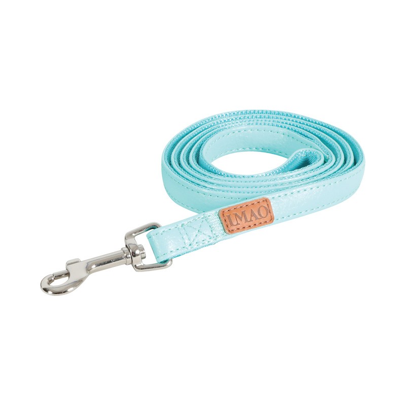 Laisse Imao Piccadilly d'une longueur de 1,20m, largeur de la sangle 25mm. Matières: PU effet grainé, doublure intérieure en Polyester. Dé en métal. Empiecement en cuir avec inscription 'Imao'. Coloris: turquoise.|