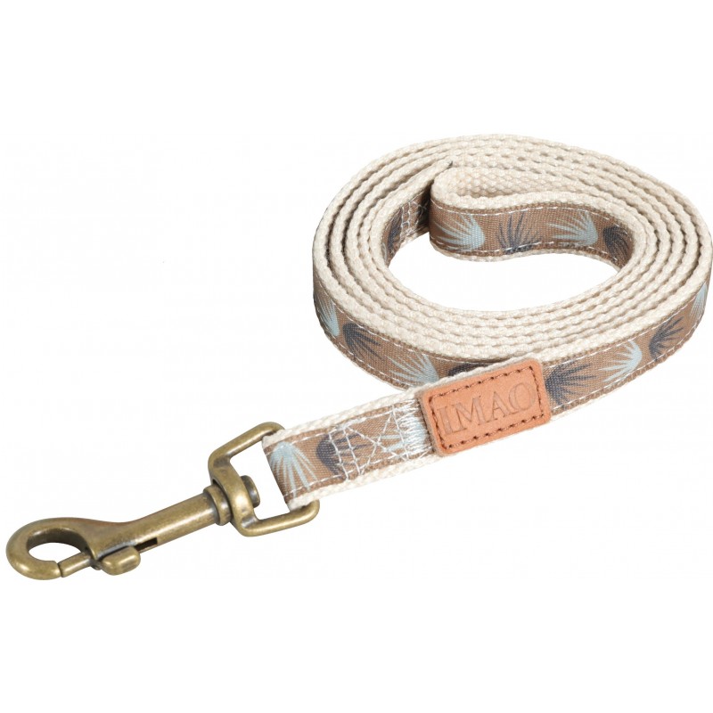 Laisse Imao Taiga d'une longueur de 1,20m, largeur de la sangle 20mm. Matières: Polyester et coton.. Dé en métal aspect cuivré. Empiecement en cuir avec inscription 'Imao'. Coloris: chocolat.|