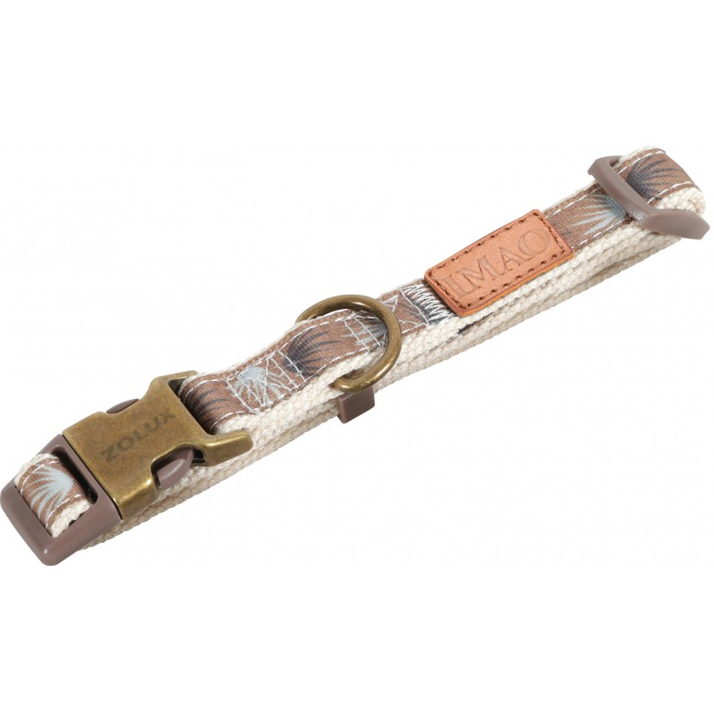 Collier réglable Imao Taiga, tour de cou de 30 à 51cm , largeur de la sangle 20mm. Matières: Polyester et coton. Passant en métal cuivré. Les boucles sont en métal CUIVRÉ et plastique. Inscription ZOLUX sur le passant de la boucle en métal. Empiecement en cuir avec inscription 'Imao'. Coloris: chocolat.|